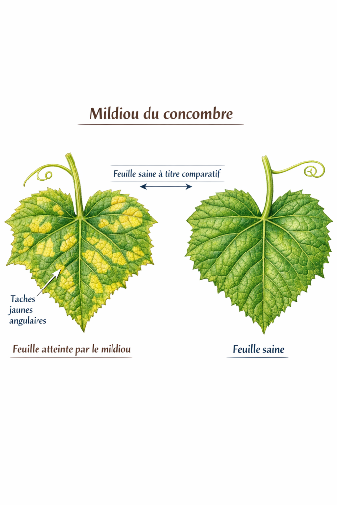 Le mildiou se manifeste par des taches jaunes angulaires sur le dessus des feuilles, limitées par les nervures, qui finissent par brunir et se dessécher. Cette maladie fongique se développe surtout par temps humide et chaud, se propageant rapidement à l'ensemble du feuillage si rien n'est fait.