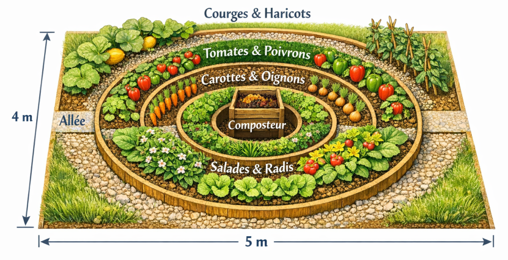 Le dessin est l'étape où beaucoup se plantent (sans mauvais jeu de mots). Si vous faites des rangées droites comme à l'armée, vous perdez de la place en allées. Pensez plutôt en "Keyhole garden" (jardin en trou de serrure) ou en "Mandala". L'objectif est de réduire la surface des chemins au profit de la terre arable.